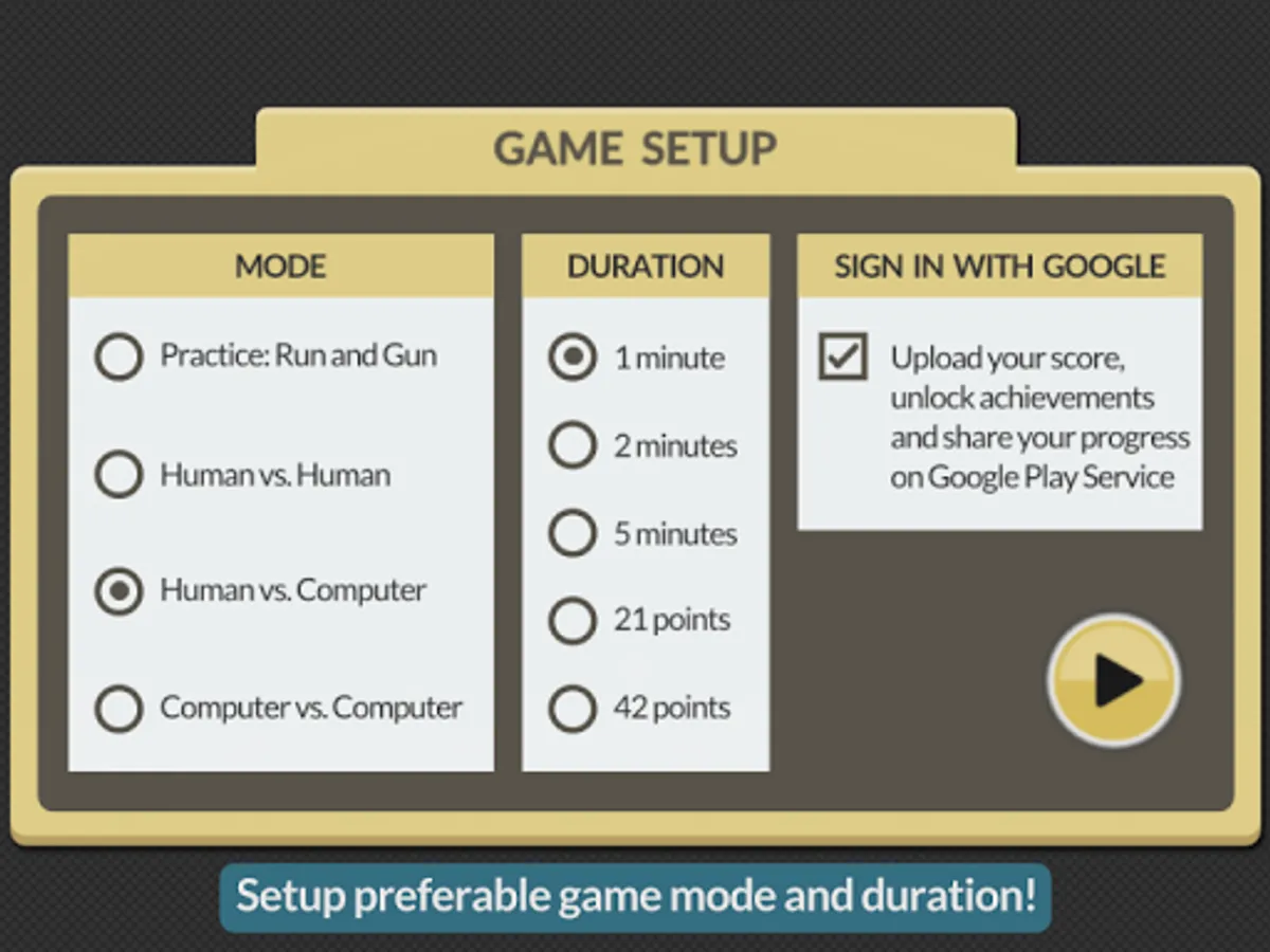 You can choose single player practice mode to sharpen your shooting skills, or play multi player live games against your mom, dad, friends or any other human being. Challenge your mobile device also and try to win and beat computer artificial intelligence. Playing and winning games against the computer AI you can unlock achievements and win gold, silver and bronze cups and other trophies.