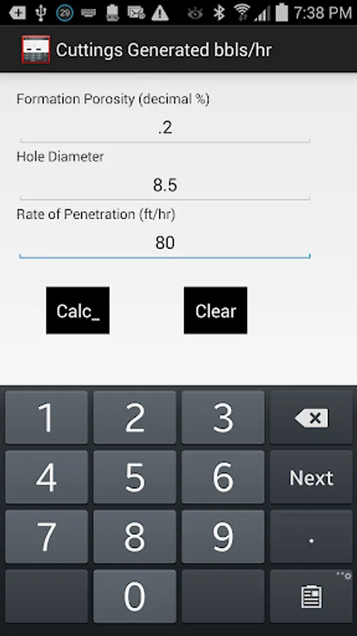 This little app will give you the bbls per hour of cuttings generated based on a given Formation Porosity (decimal %), Hole Diameter (inches) and ROP (ft/hr). This app has been tested on several different android devices.