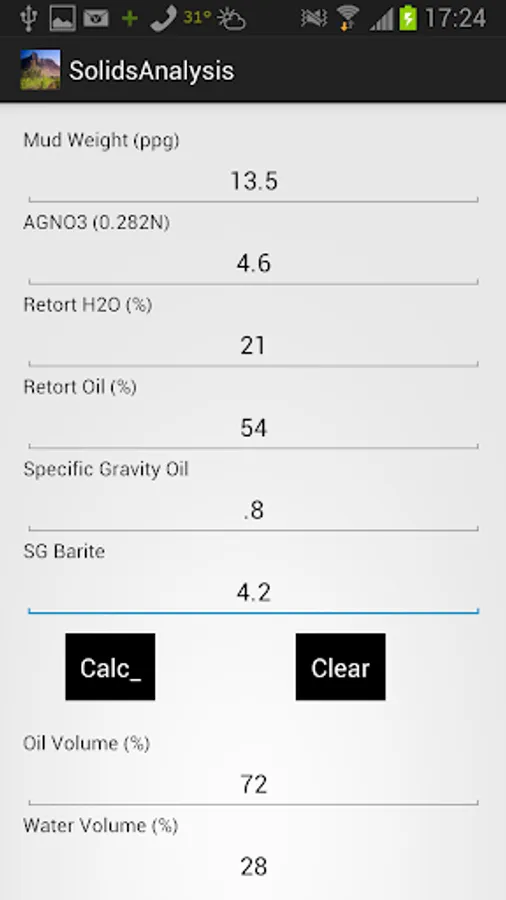Solids Analysis is a calculator for synthetic based fluids as well as oil based fluids. This is a common tool used by mud engineers worldwide. This particular calculator has a 17 item output analysis.