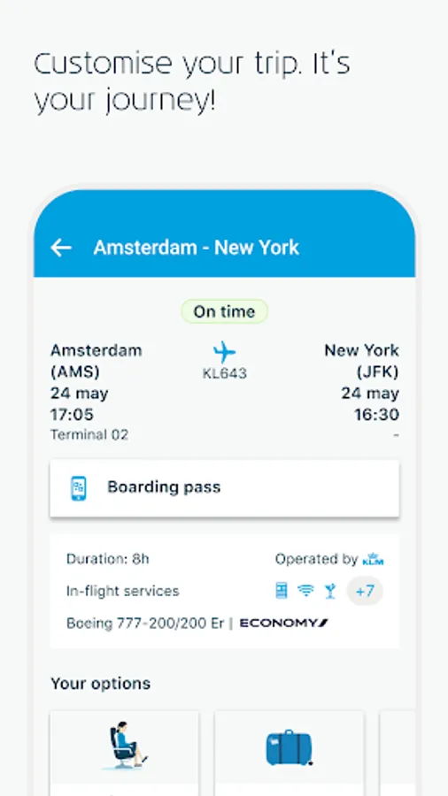 View the pre-travel checklist and adjust your booking at any time until check-in. Lounge access or extra legroom? Enhance your travel experience yourself with just a few taps.