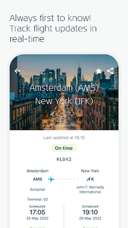 Turn on your notifications for real-time updates like gate changes and check-in times, and receive exclusive offers. Share your flight status to stay in touch with those on the ground. They’ll be happy to know you landed safely and sound.