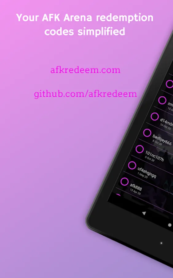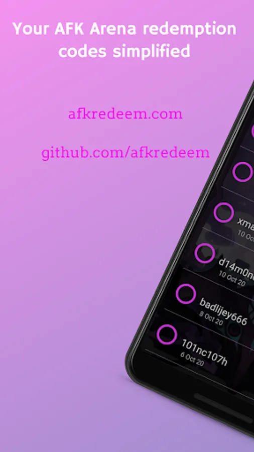 This app's purpose is to help redeeming gift codes for a mobile game called "AFK Arena".