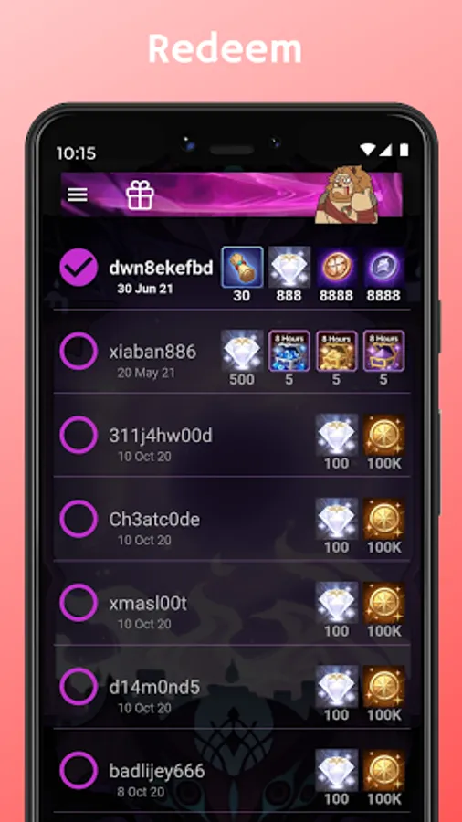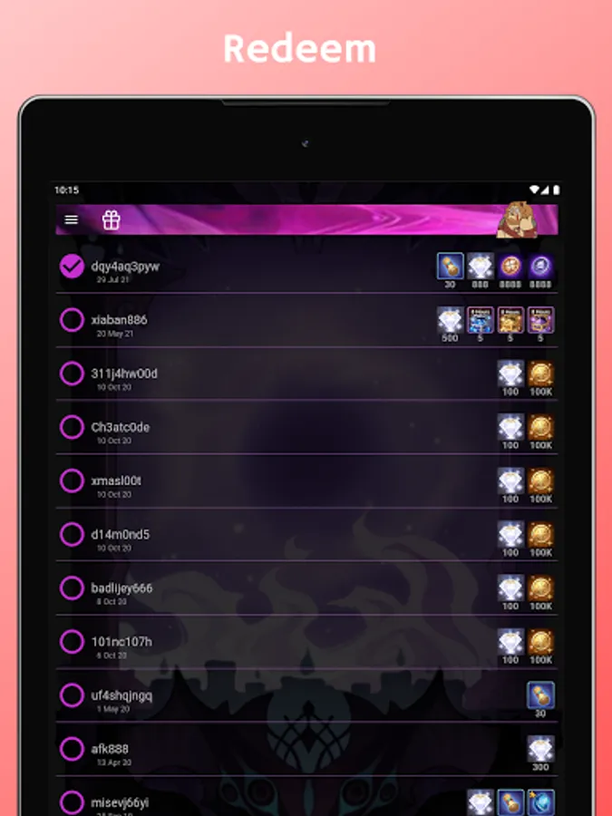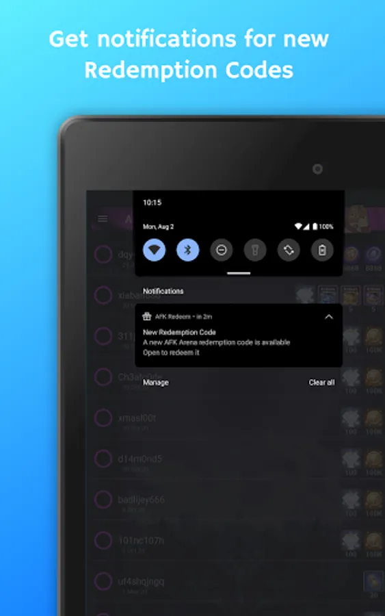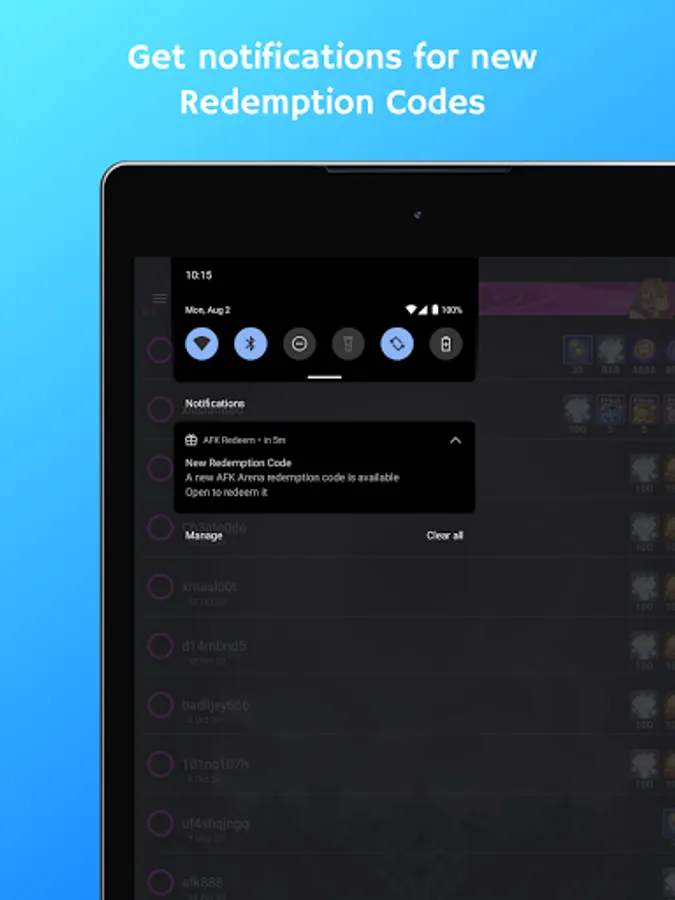 Get AFK Arena redemption codes notifications and redeem gift codes to multiple accounts straight from the app.