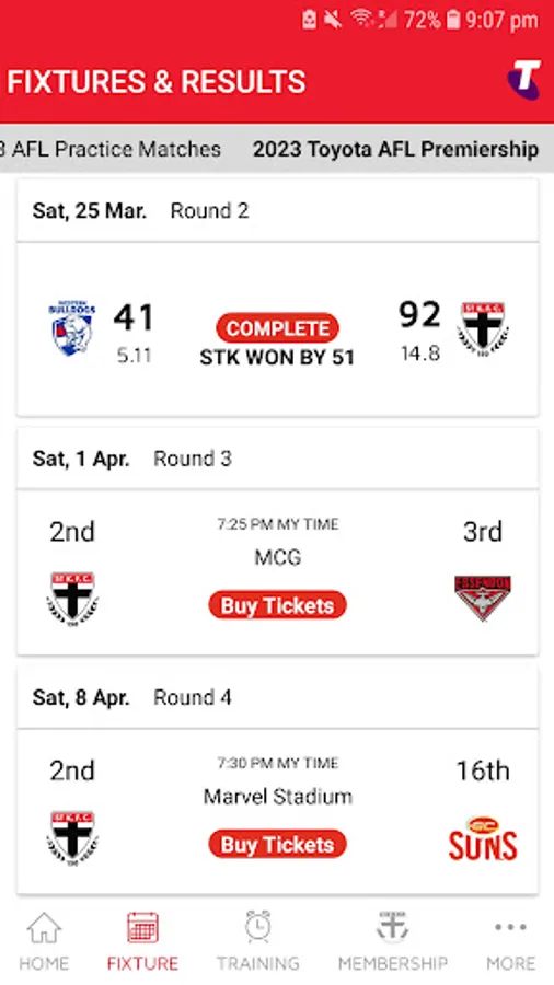 - Match details for the season including Fixture, Results and Ladder