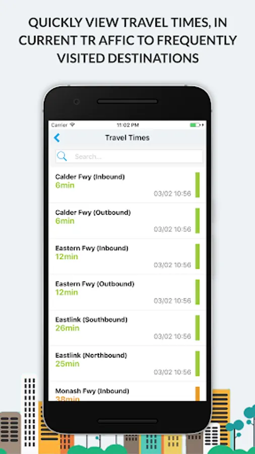 I.Map of Melbourne areas with traffic conditions overview of the city in real time and update automatically, e.g.: green road is very good condition; yellow road is a little slow; red road is very slow, etc.