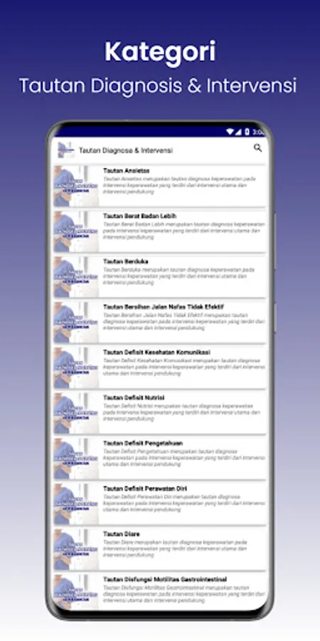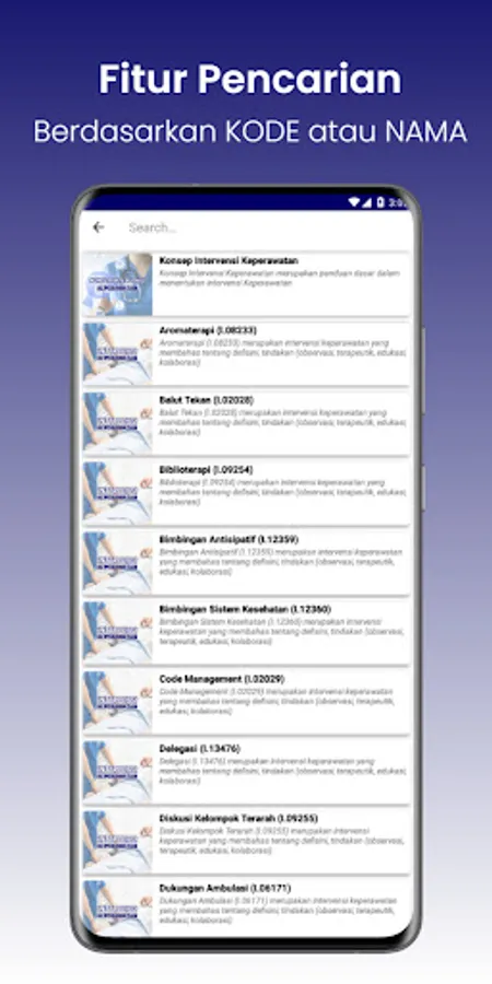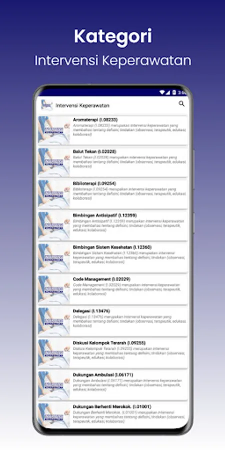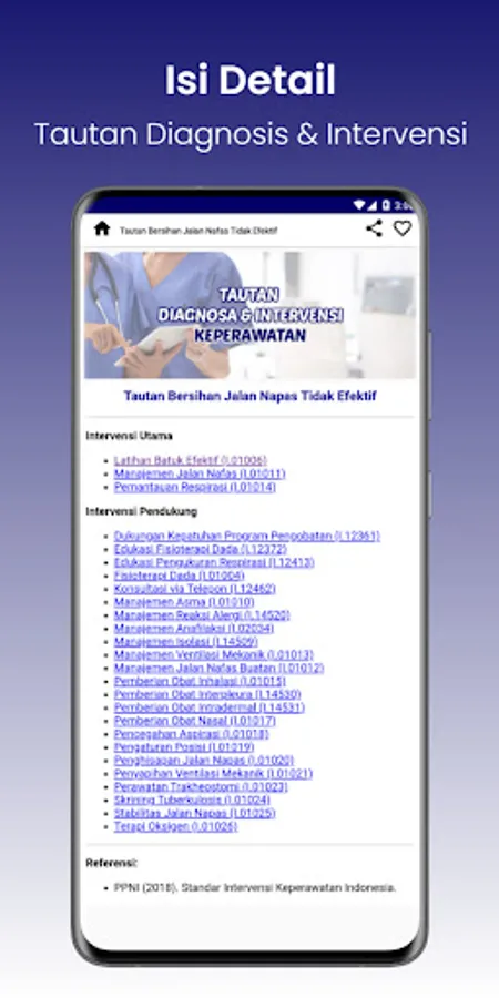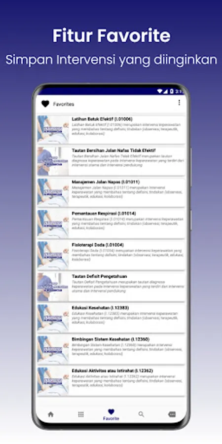 The nursing intervention application is very easy to use and is equipped with a search feature based on the Intervention Code, Intervention Name and Link besides that there is a Favorite feature.
