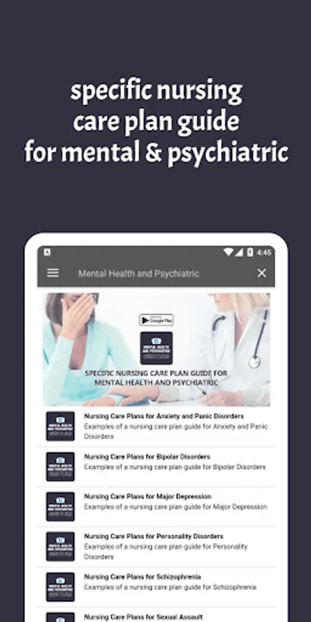 This app discusses specific nursing care plan guide for Mental Health and Psychiatric Care Plans have 41+ Care Plans Examples