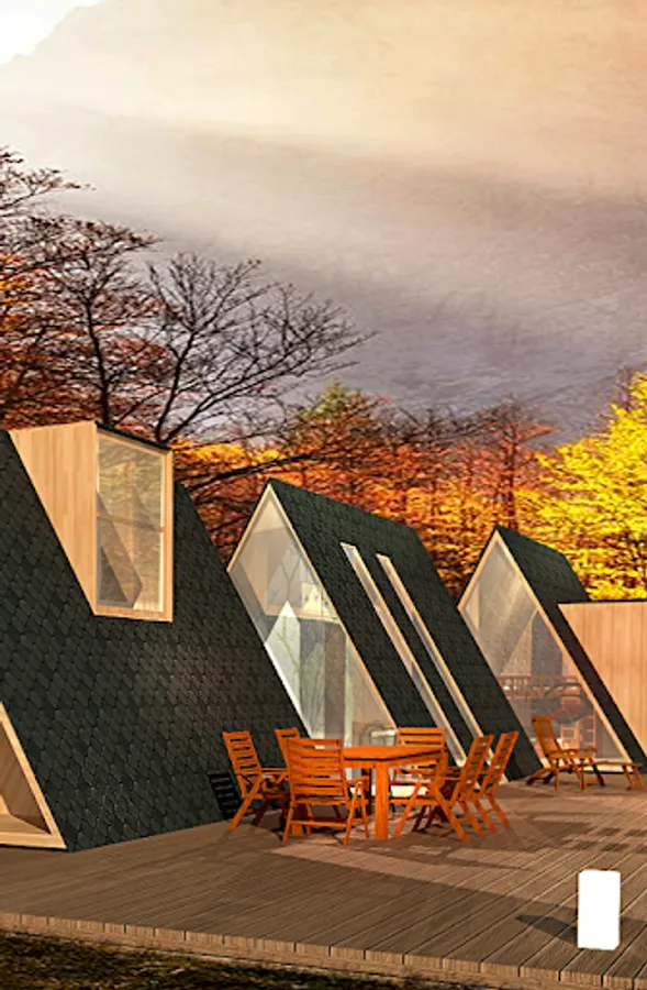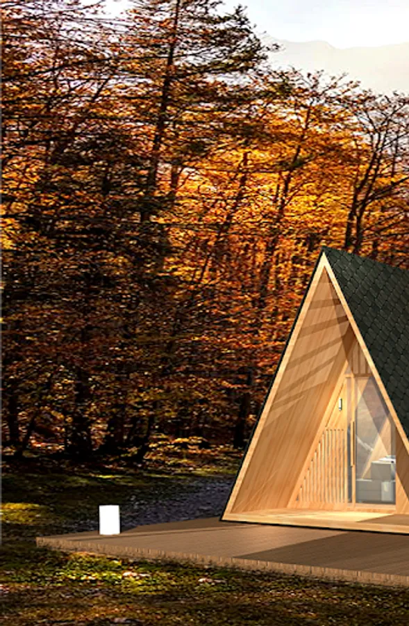 An A-frame cabin is a building with a tall, triangular roof that resembles the capital letter "A." Typically, an A-frame is a two-story or three-story structure with a wide first-floor living area, a smaller second story above the living room, and a tiny top floor that serves as a sleeping loft. The front and back of the cabin generally have large windows that let in natural light. The energy-efficient design of A-frame cabins is perfect for cooler climates where there’s little need for air conditioning, which makes off-grid living possible.