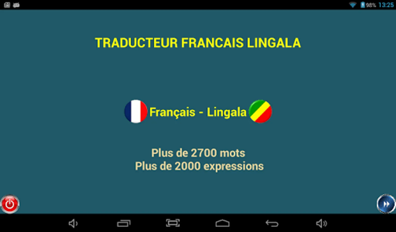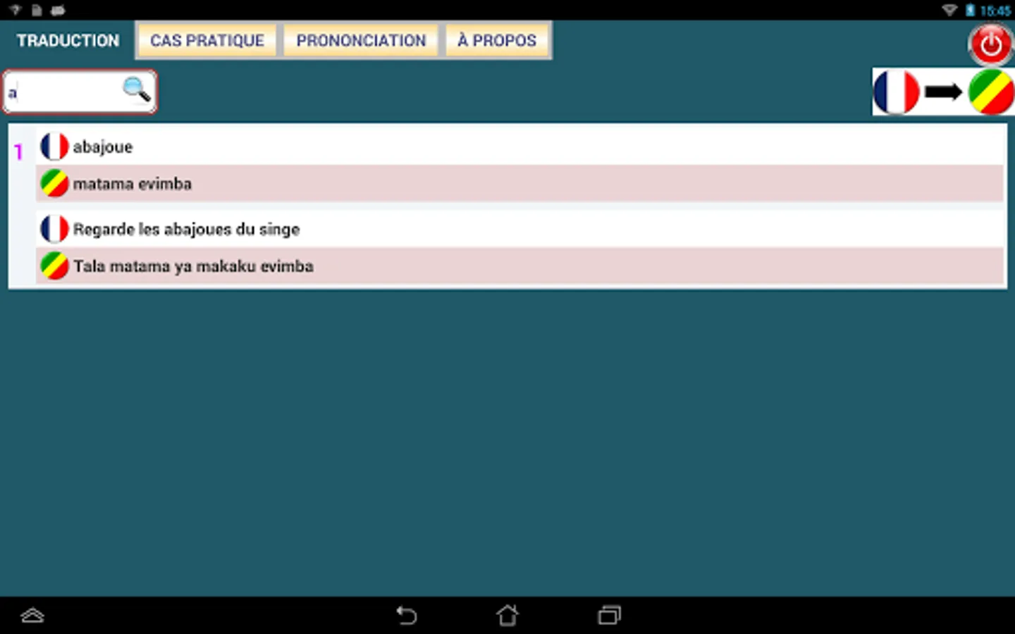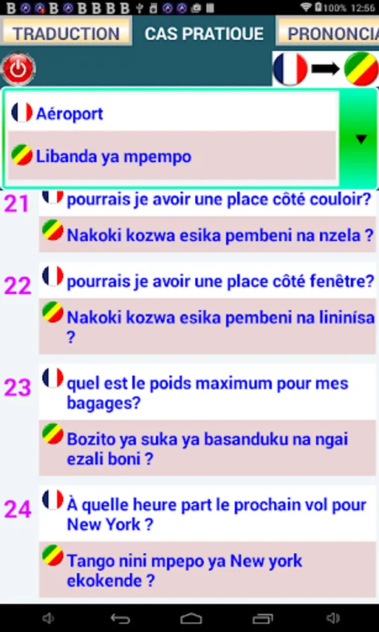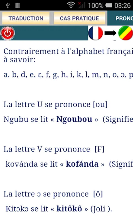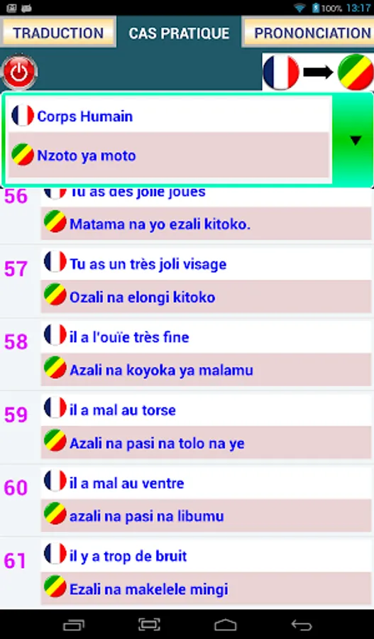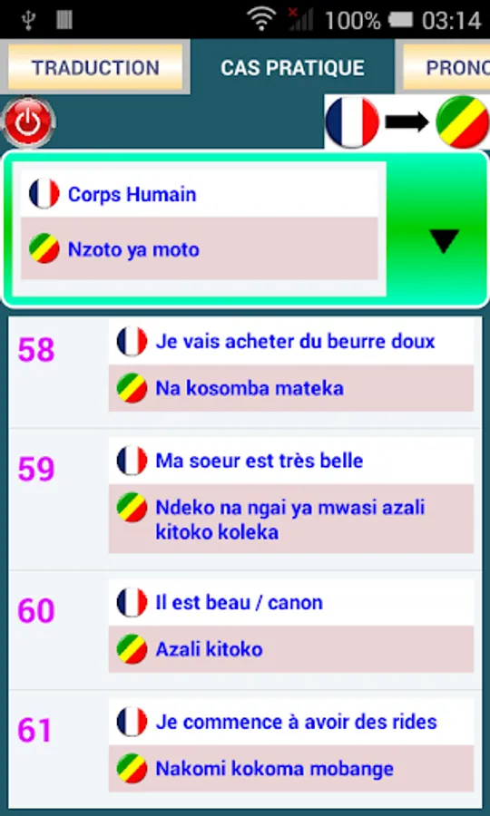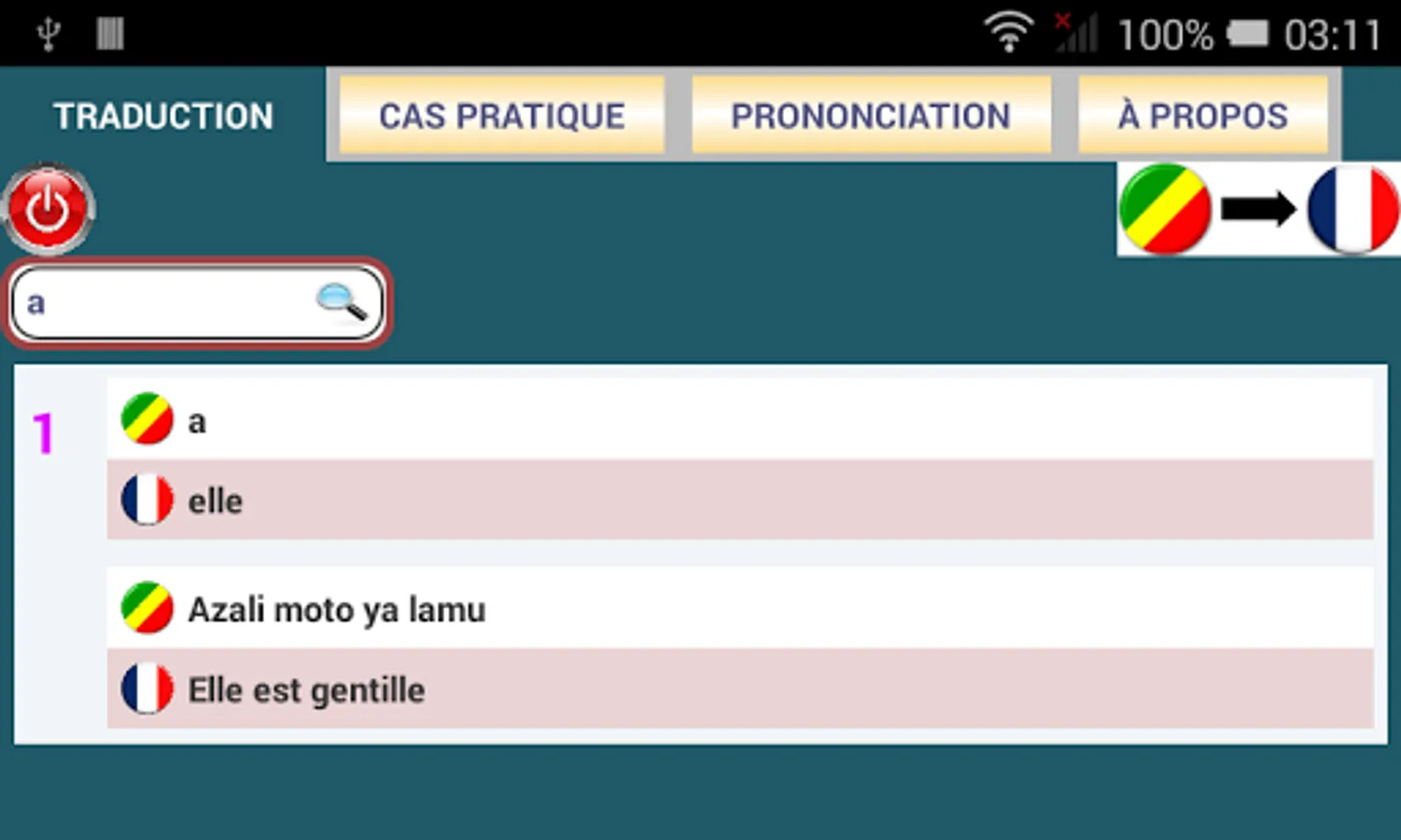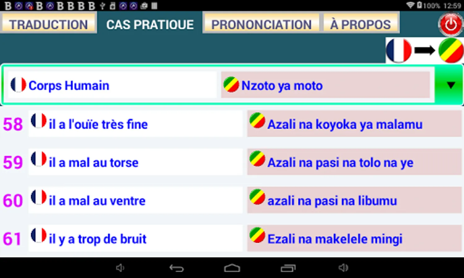 Outside the translated words, this translator is composed of several expressions of everyday life translated from French to Lingala and Lingala to French. These phrases are arranged by category are: