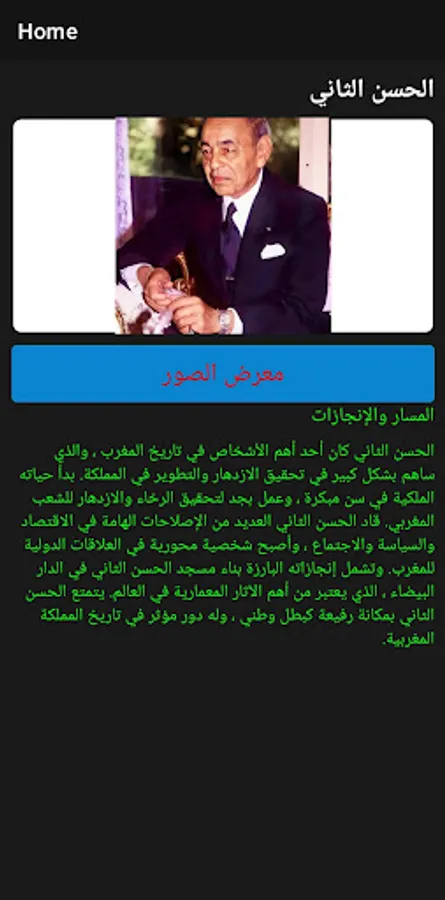 “Hassan II: Pictures of Remembrance” is a mobile application that celebrates the memory of the late King Hassan II, who was ruler of the Kingdom of Morocco from 1961 until his death in 1999. The application includes a large collection of rare and well-known pictures of King Hassan II, as well as texts explaining his achievements and his biography. The app allows users to share these photos and information with their friends and family via social media and email. The application "Hassan II: Anniversary Photos" is a great reference for those interested in the history of Morocco and the personality of King Hassan II.