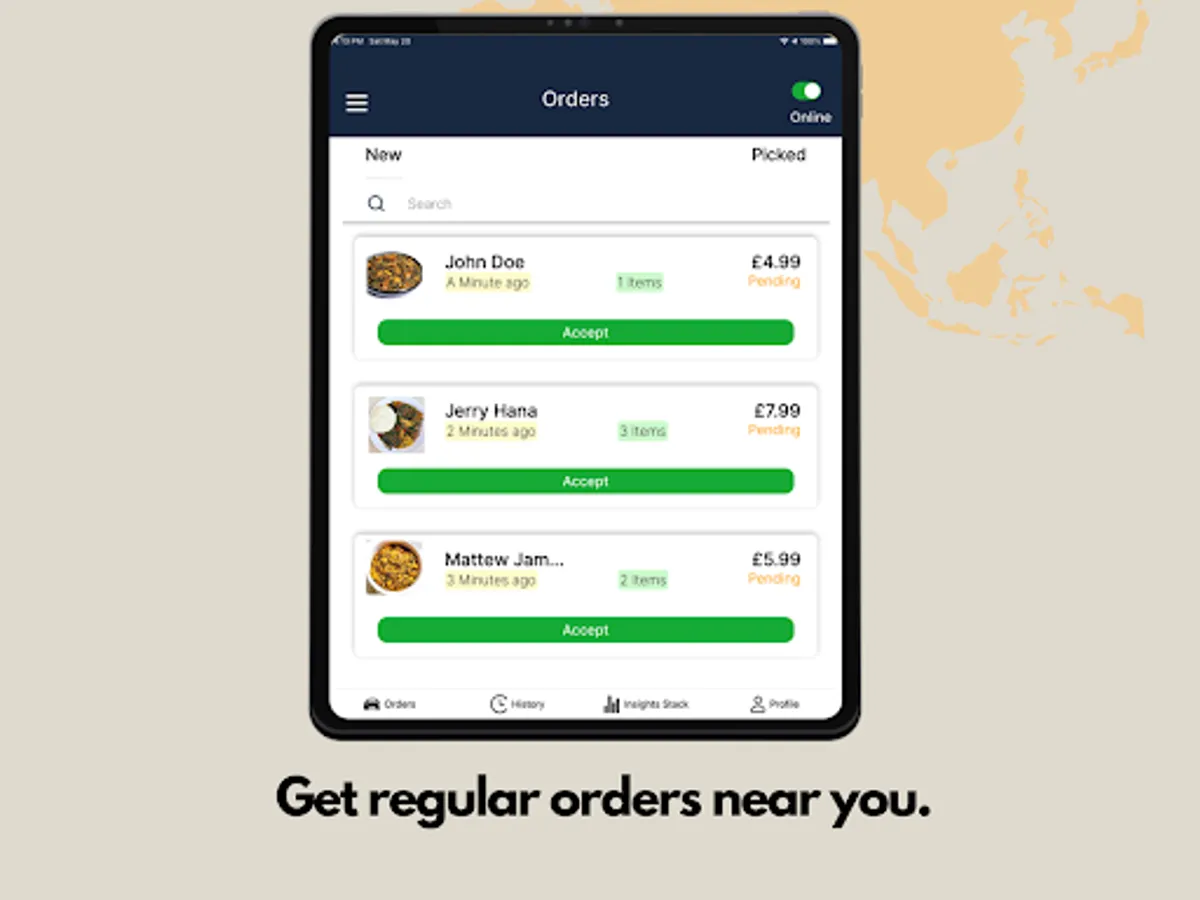 Instant Notifications: Stay connected with instant push notifications. Receive alerts for new delivery requests, order updates, and customer messages, ensuring you stay informed and never miss important information.