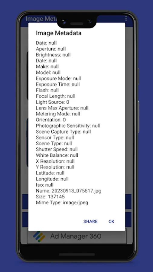 Image metadata viewer allows you to view your images metadata from your phone storage. Simply load images from your gallery and click on view metadata to view the photo metadata.