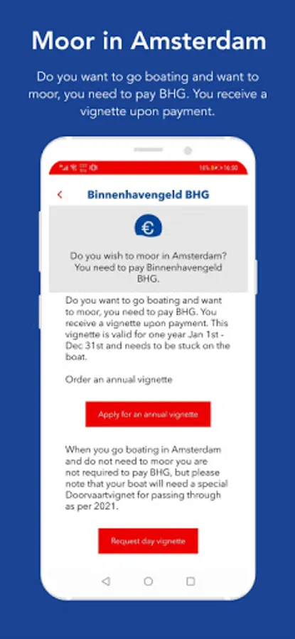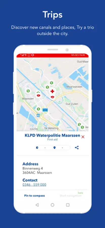 The app helps recreational boaters sailing in Amsterdam and its surroundings to the best experience on the water. Navigate by your dashboard to your personal favourite location or another point of interest combined with an estimated time of arrival, enjoy a boat trip through the canals of Amsterdam or the near countryside, get inside information about various highlights and much more.