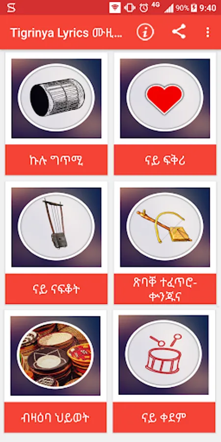 This mobile application contains selected Tigrinya music lyrics. The music poems are categorized in 14 groups based on the message. There are more than 150 Tigrinya Music poems in this mobile application.