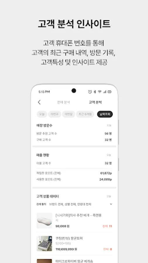 You can search for registered customers through the customer's mobile phone number, and manage recent purchase history and visit history.