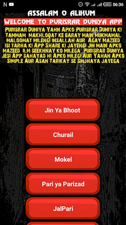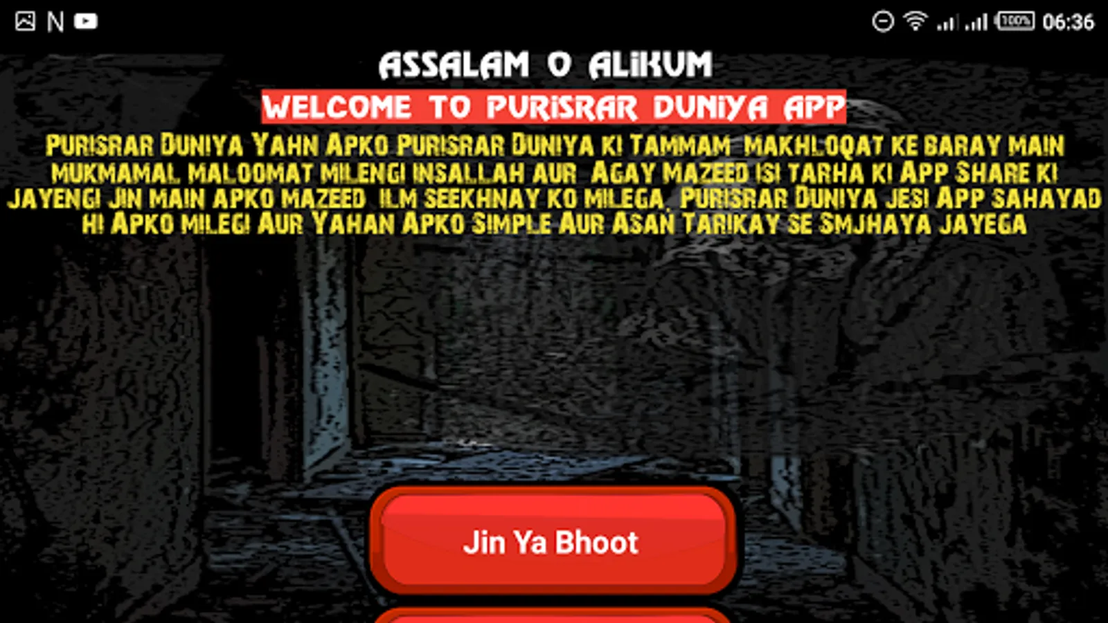 Purisrar Duniya App main apko beshumar maloomat milengi is ap main apko jin,hamzad,pari,mokel,kala diyo,naag ,nagin,rooh,badrooh,jadu,tantar,jalpari,churail ,afreet ya ifreet sab par ke baray main tafseel se ilm seekhnay ko milega,