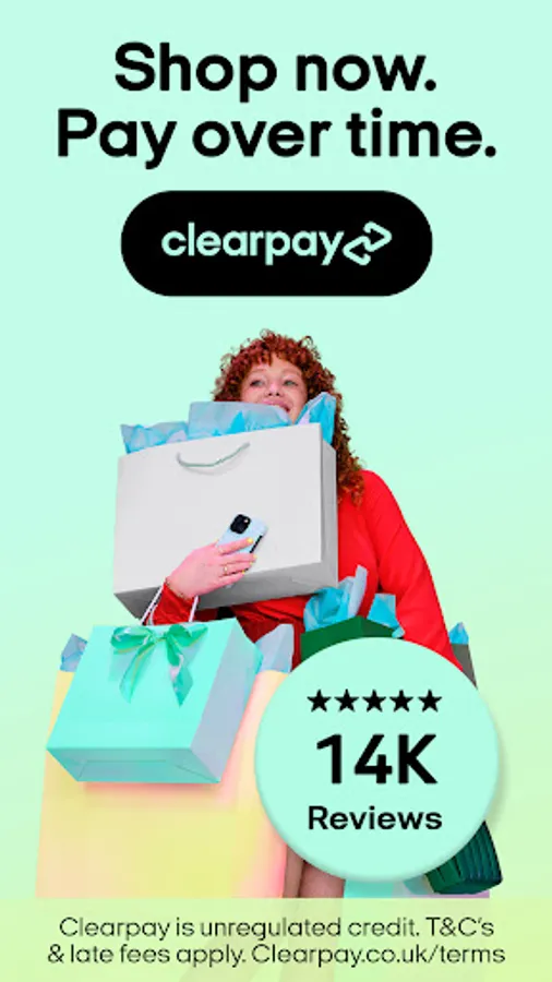 *Please use Clearpay responsibly. Clearpay is unregulated credit. Clearpay lends you a fixed amount of credit so you can pay for your purchase over 4 instalments, due every 2 weeks. You must be 18+ and a permanent UK resident (excl Channel Islands). T&Cs and other eligibility criteria apply.