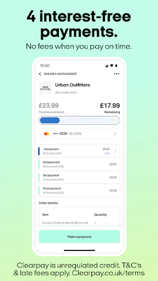 Ensure you can make repayments on time. Clearpay charges a £6 late fee for each late instalment and a further £6 if it’s still unpaid 7 days later. Late fees are capped at £6 for orders under £24 and the lower of £36 or 25% of the order value for orders over £24. Missed payments may affect your ability to use Clearpay in the future and they may pass unpaid debt to a debt collection agency.