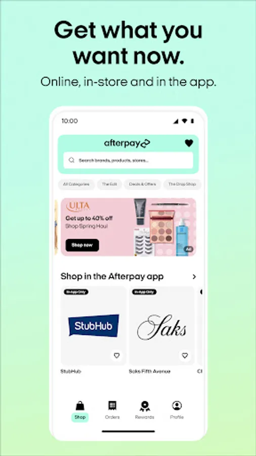 Afterpay offers app-only benefits to give you more access to the deals you love. Shop online and in-store in the Afterpay app and split the cost in 4 interest-free* payments. Browse stores, brands, products, discounts, and gift cards across top brands in fashion, beauty, home, toys, tech, travel and more. New brands and deals added daily! Check out our 700k+ five-star reviews for more reasons to start shopping on Afterpay.
