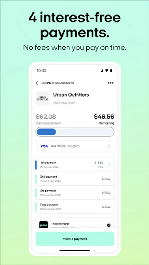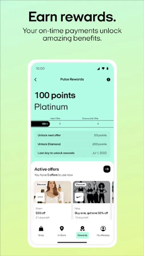 Our loyalty program rewards you for making on-time payments. Earn benefits like exclusive offers from top brands you love, no payments up front, and more—only in the Afterpay app.