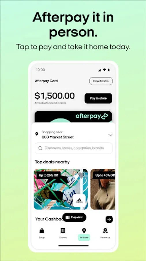 Find shopping, travel, tech and beauty retailers offering Afterpay in stores, and shop confidently knowing how much you are pre-approved to spend. Just open the app and simply add your Afterpay card in your virtual wallet and tap to purchase.