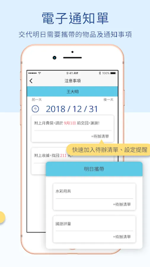 3. 通知單:家長可以得知學童明日需要攜帶的物品,以及老師叮嚀的注意事項。