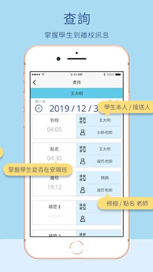 7. 查詢:孩童的到校、點名、離校狀態,都可以輕易查詢。