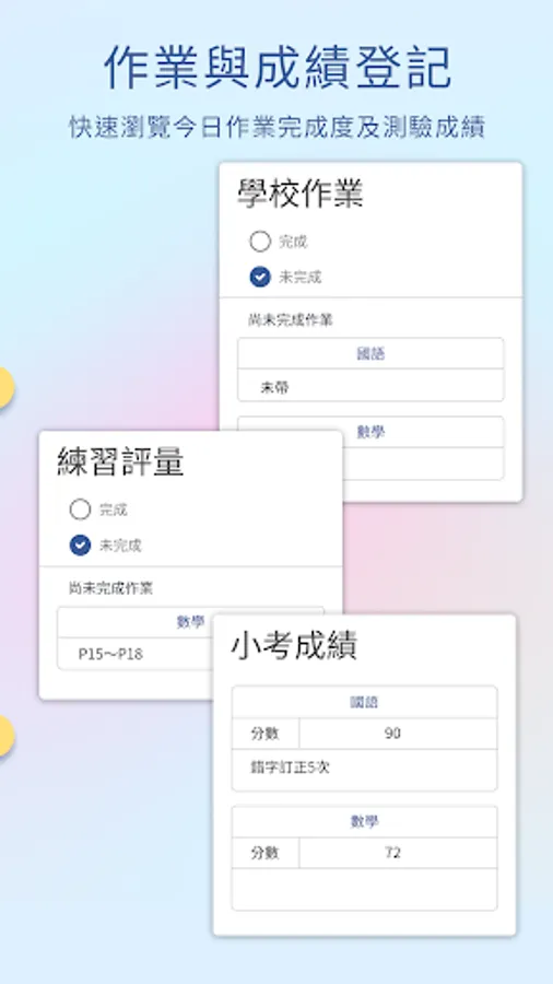 4. 作業與成績:家長可以由此快速得知學童的學校作業完成與否、安親班的練習評量完成與否,以及各科目的小考成績。