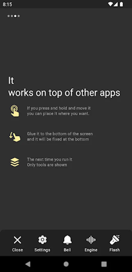 All of these features are utilized by setting them up to be displayed on top of other apps. Please make sure to grant the necessary permissions.