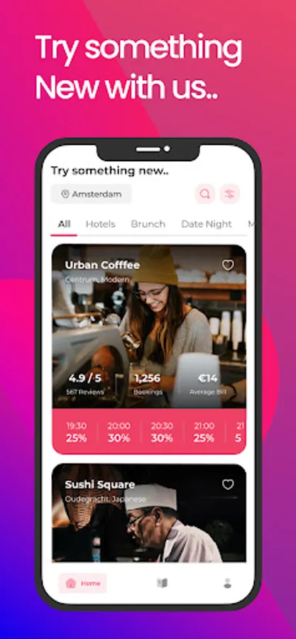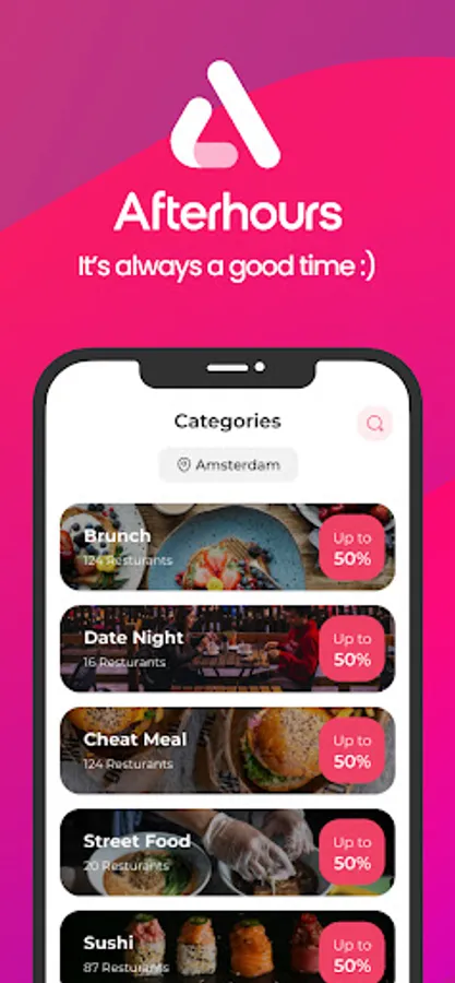 Use Afterhours to discover upscale dining locations, hotel restaurants, and gourmet delicacies in urban areas. Afterhours features an extensive selection of elite and full-service venues, all offering fluctuating rates on their complete menus, every hour of every day. There's no need to fuss about payments or particulars, as Afterhours is free 100% of charge. Just select your time and rate, book your desired time, and arrive at your table, everything else is taken care of.
