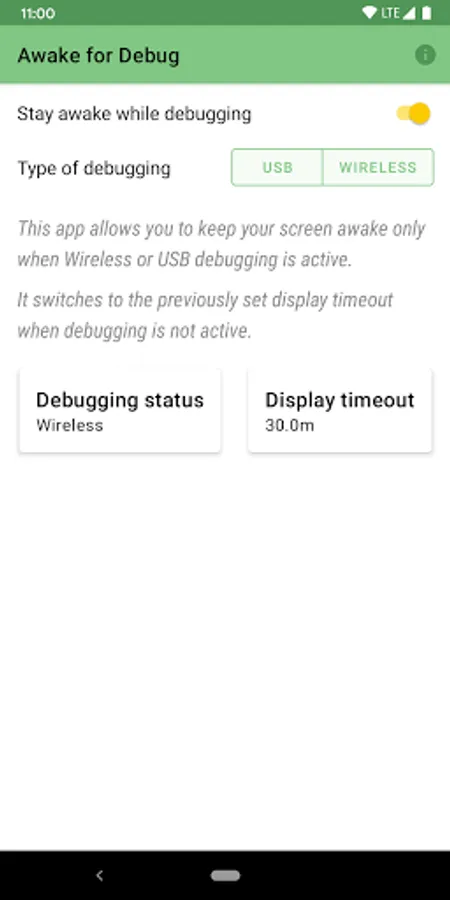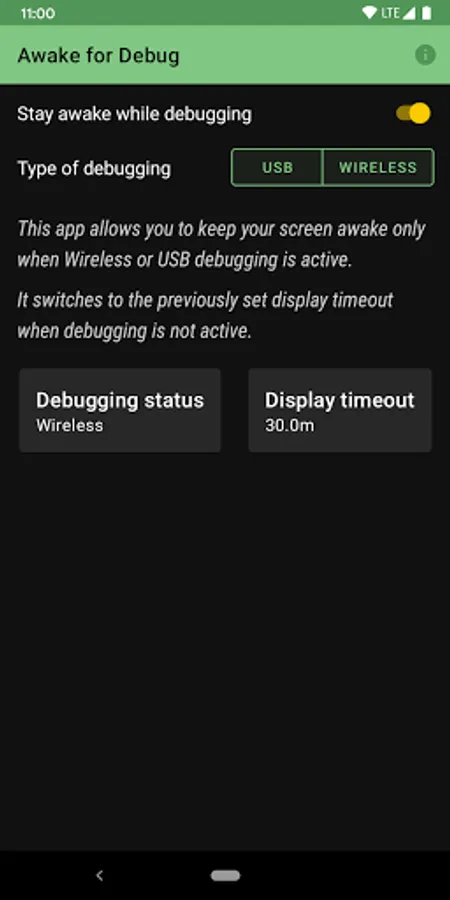 This app allows you to keep your screen on *only* when debugging is active on the device over Wifi (on Android 11) or USB.