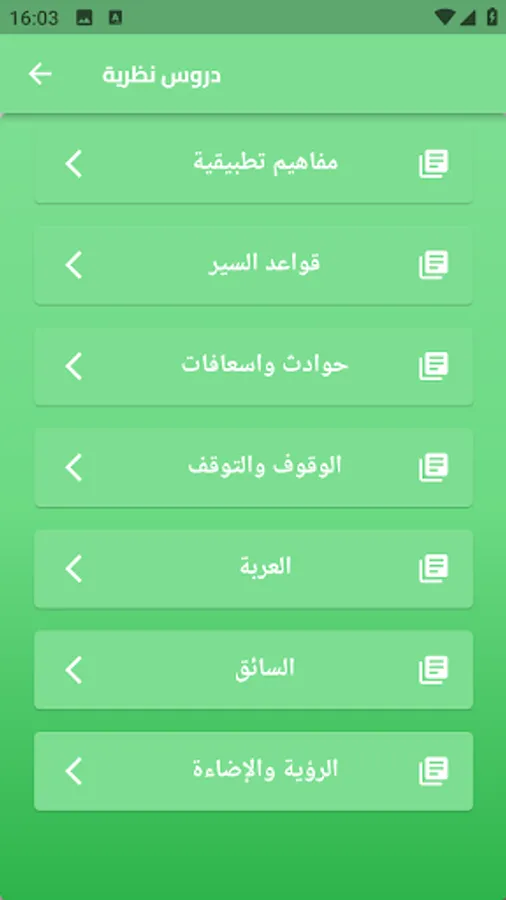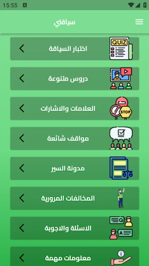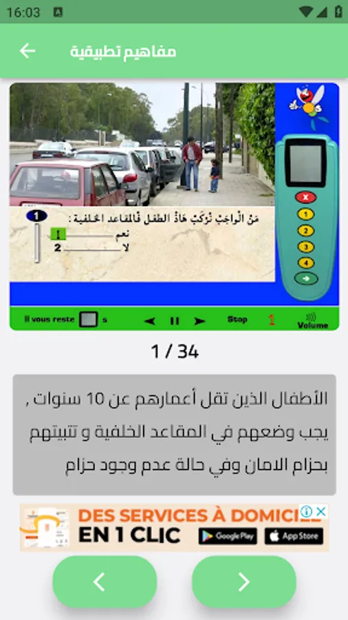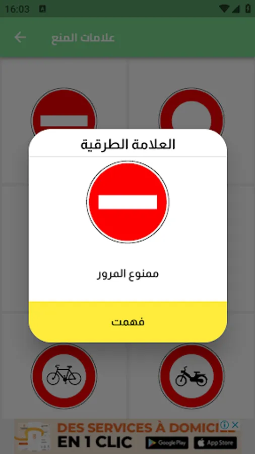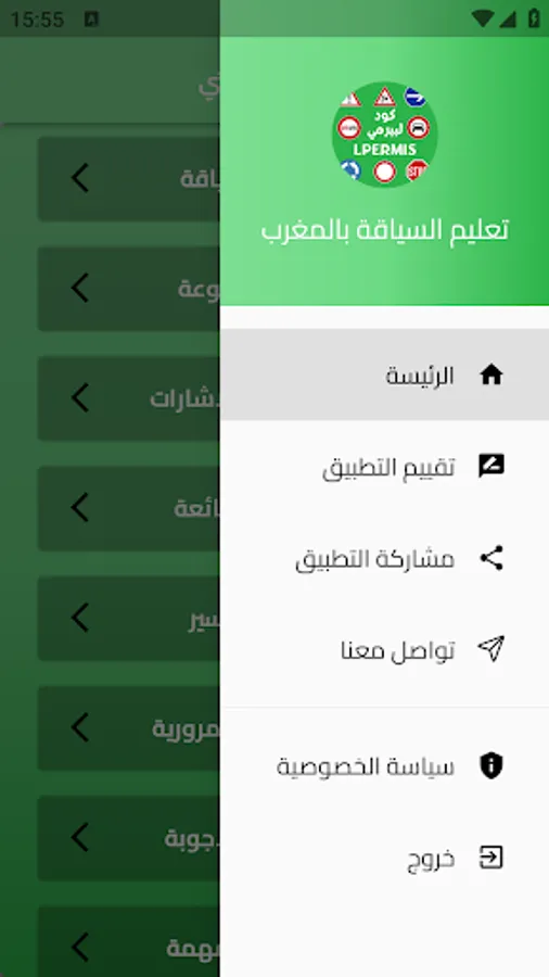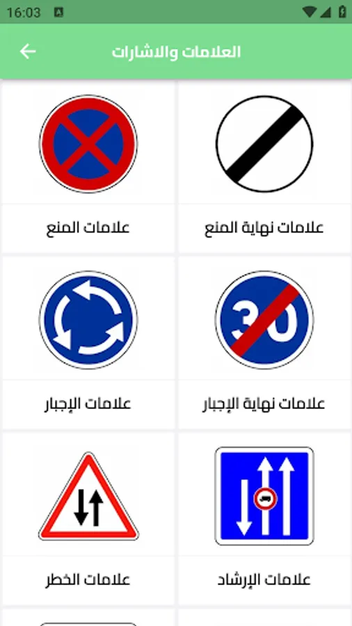 3. Traffic rules (road code): The application explains the traffic rules issued by the Moroccan authorities, including the rules for overtaking and adherence, the priority of overtaking, stopping and stopping, and how to deal with traffic accidents.