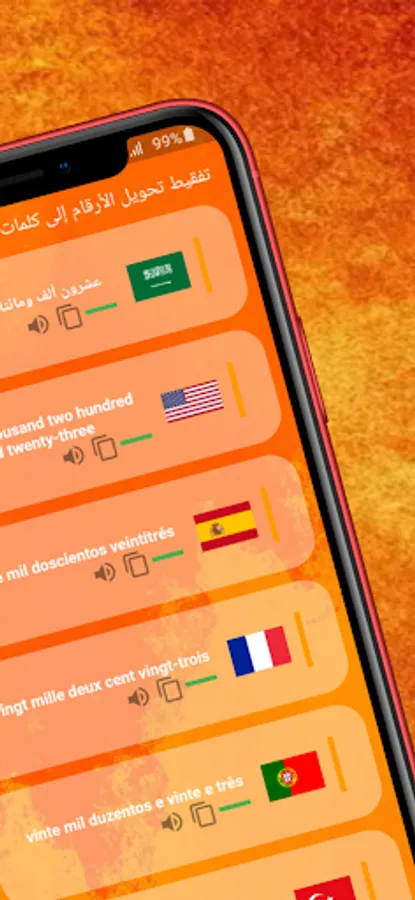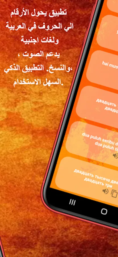Taqfeet application: "Converting numbers into words" is an advanced application that provides the service of converting numbers into letters in Arabic and some other foreign languages. The app helps to deal with difficult numbers that may not be included in your native language. The user can listen to the audio that depicts the number he wants to convert, and he can also copy and paste the converted number into Arabic or the other chosen foreign language. The app supports many different languages, which makes it a number of good options for different native languages. The application is smart, easy to use, and includes the necessary tools to convert numbers to letters, which makes the application suitable for everyone, from beginners to professionals. It makes the app the first choice for all who want to deal with difficult numbers that may not be included in their native language.