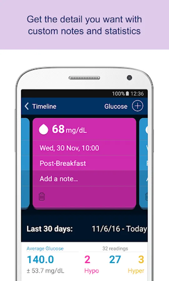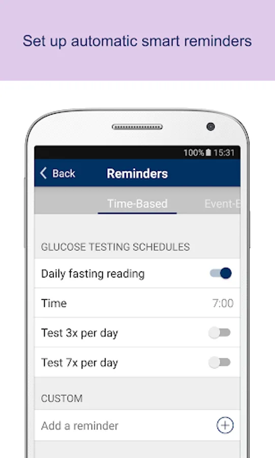 Set reminders: for example, to be alerted automatically to test again 15 minutes after a hypo result.