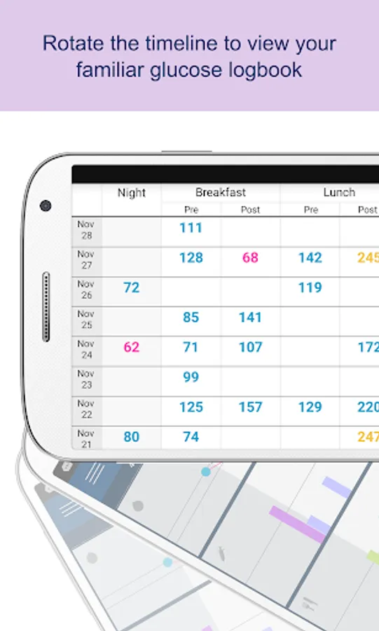 Rotate the app for the glucose logbook to review your glucose readings over multiple days.