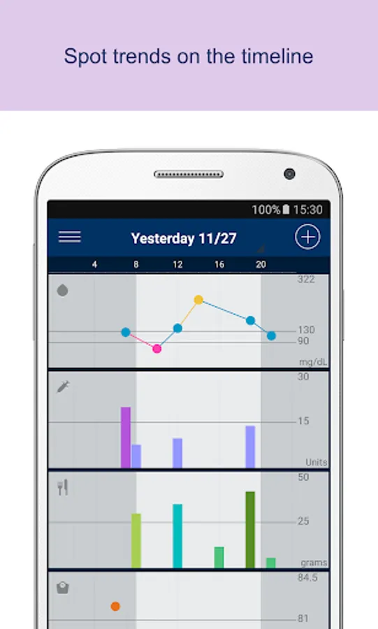 Track all your data—glucose, insulin, carbs and weight— in one place to easily spot trends. Choose the view that works best for you: 1 day, 1 week or 1 month.