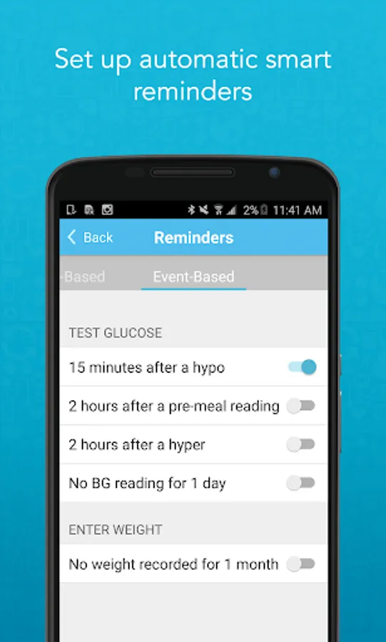 • Reminders can be automatically triggered by another event; for example, 15 minutes after a hypo result, you will receive an automatic reminder to test again.