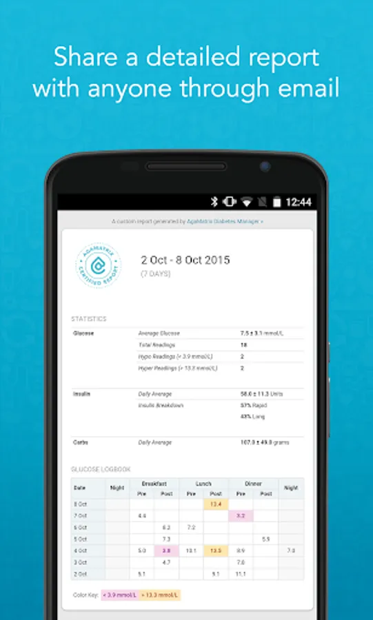 • Data points are color-coded so you can spot high and low blood sugar at a glance.