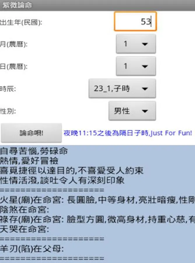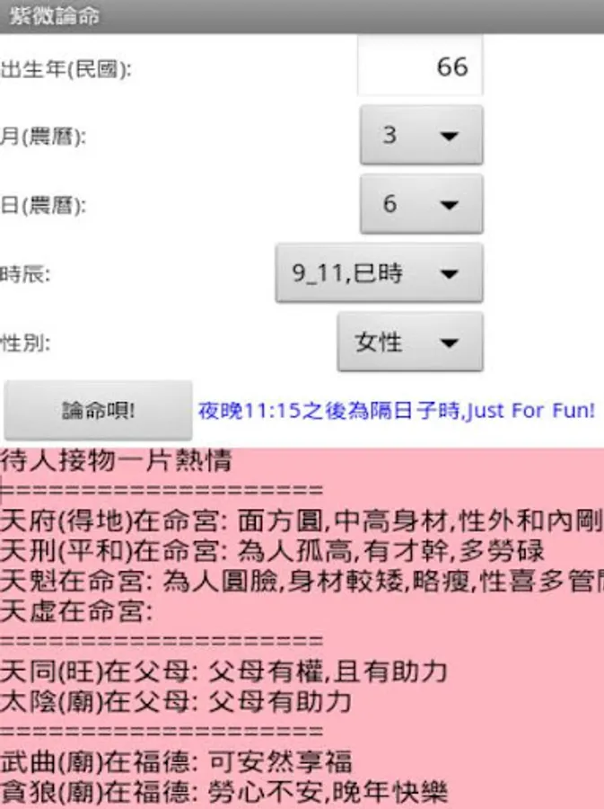 紫薇論命,純娛樂,人生本應享受過程,活在當下.這是一個小而美的論命程式,提供輕鬆的批命結果,不需使用者自己解盤,請以休閒的心情享用,其特色在於簡單且加入古文的詮釋!