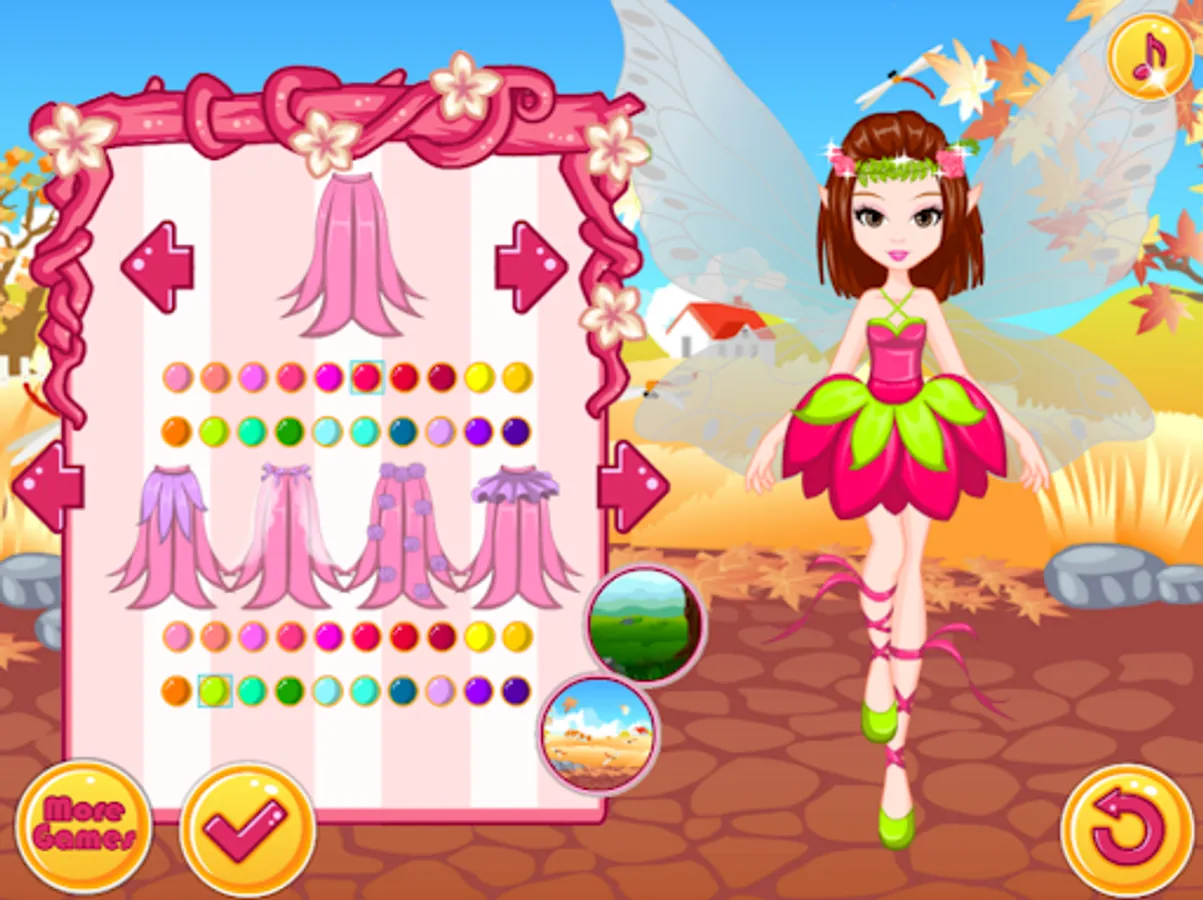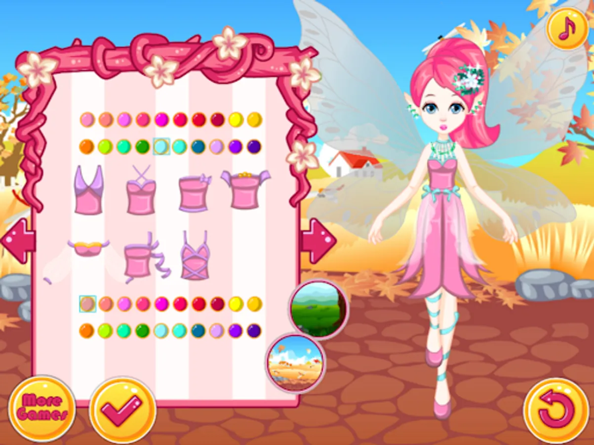 All girls will just love this cute anime game of fairy princess makeup and dress-up games for girls. with tiny fairies to dress up and a huge selection of fancy items and accessories to choose from. So show off your skills of royal fairy princess dress up game and play with your imagination by selecting from tons of combinations: hairstyles, dresses, shoes, wings, magic wands, and makeup with the ability to change colors to enjoy the fun of DIYing your fashion. And many other types of items for your fairy of fashion dress up girl makeover game to design your style by matching different items you like of themed outfits. Also don’t forget to personalize your fairy character from lots of options by changing her facial expression and eyes, skin and hair colors, and shapes. Try your skills and have a bundle of fun from fantasy fashion games. You may also select a suitable background, where you are going to work on the image of beauty.