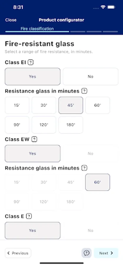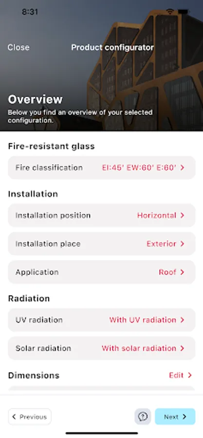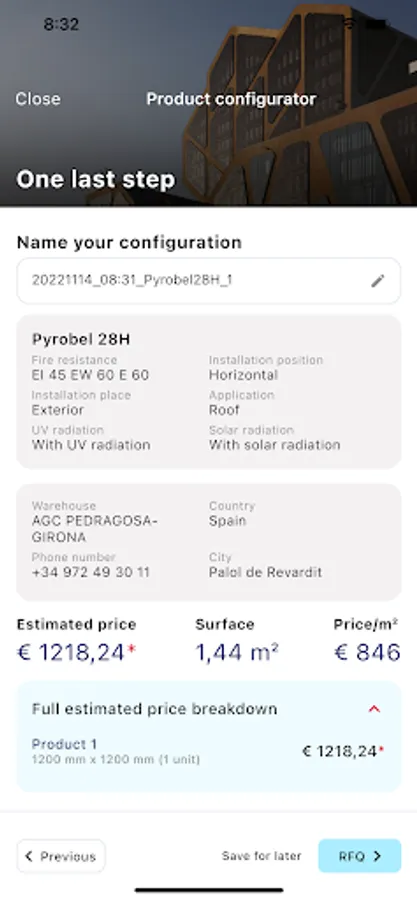 Fire-resistant glass configurator to select the right fire-resistant product for your project, view the needed specifications and the available accessories (frames) as well as to consult the documents and certificates and to get the preliminary pricing. You can save your configuration as a draft and use it later or download it and send it to your email.