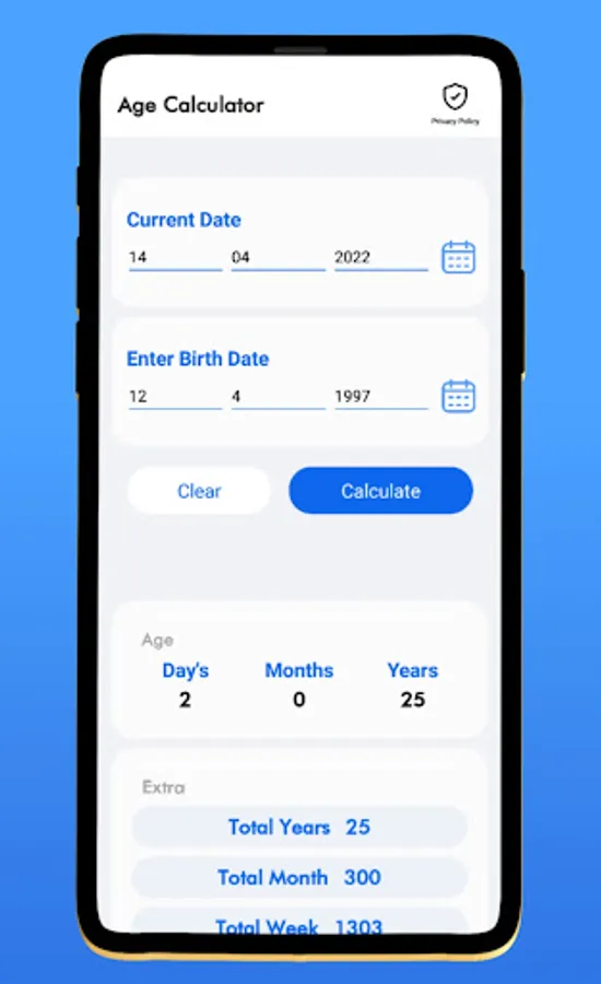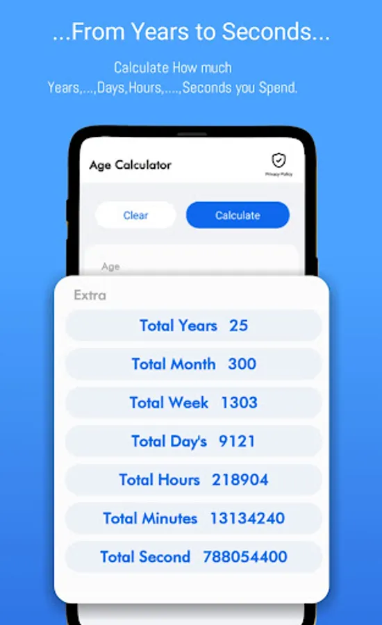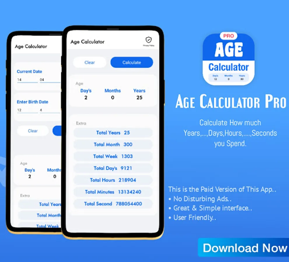 You can calculate your age and also find total years,months,weeks,days,hours,minutes and seconds.