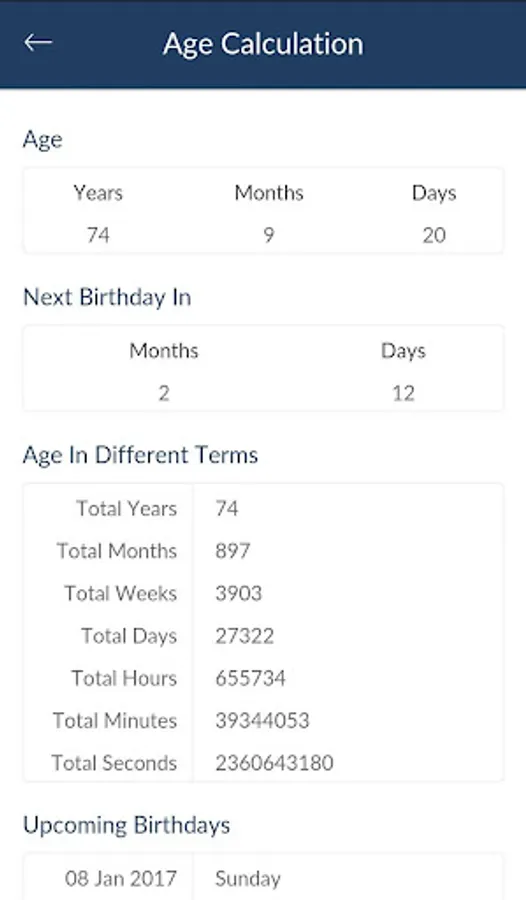 You can also view your age in total years, total months, total weeks, total days, total hours, total minutes and total seconds simply by age calculator.