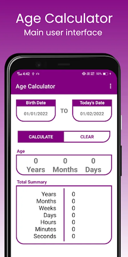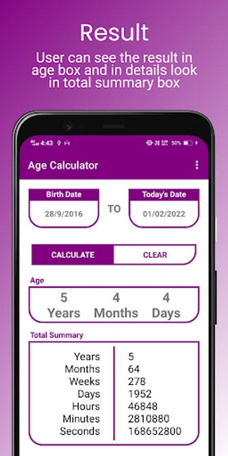 This app will help the user to calculate age for birth date to current date and user can select or directly type birth date and this app generate graphical result to the user like :- Years, Months, Weeks, Days, Hours, Minutes, Seconds