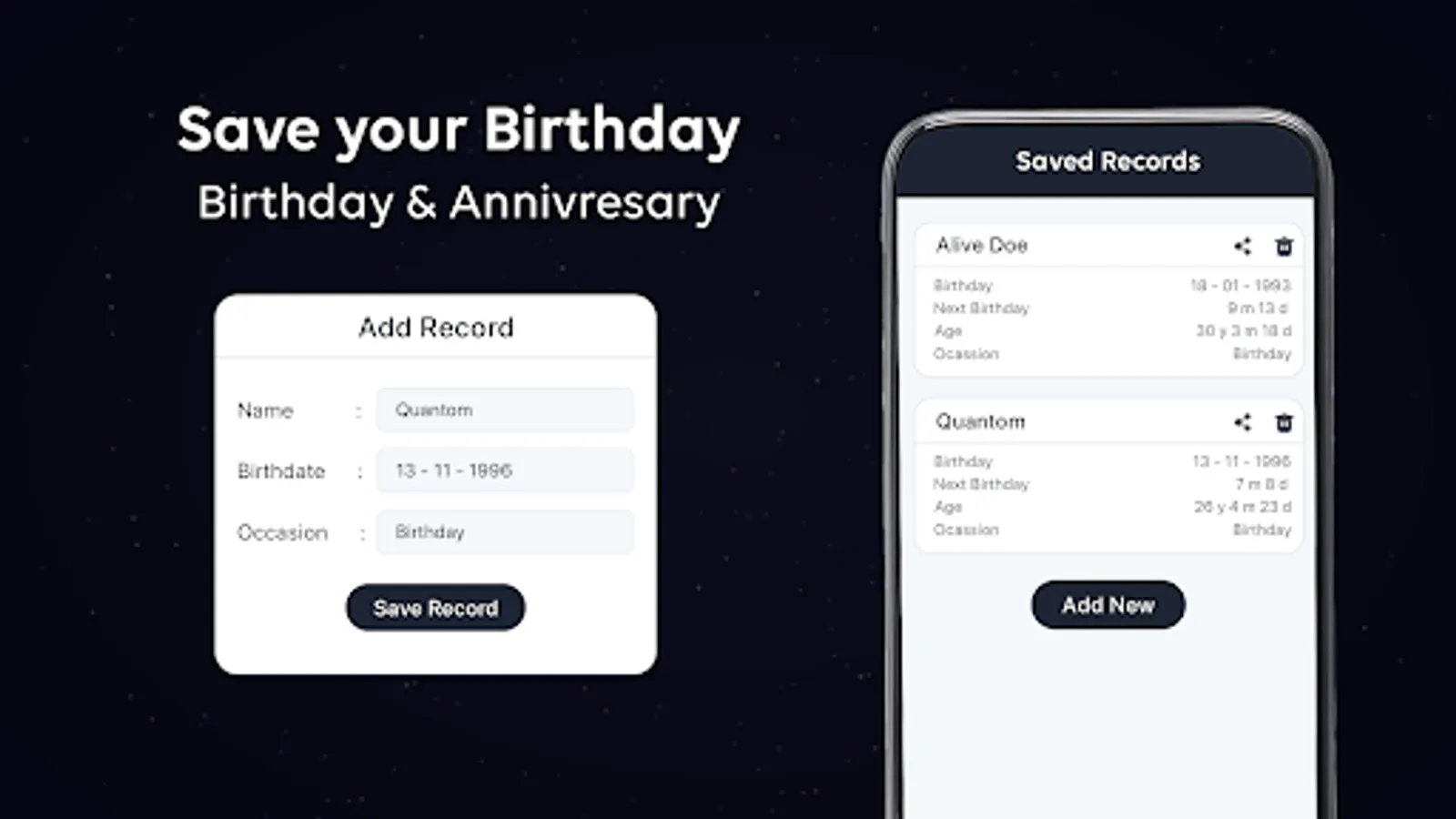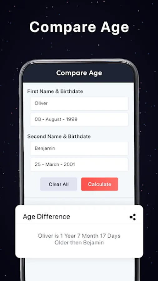Overall, an age calculator by date of birth app is a useful tool for anyone who needs to calculate someone's age or track the time between two dates with age tracker. And stay informed of your friends & family members birthday information and find out age difference by age difference calculator.