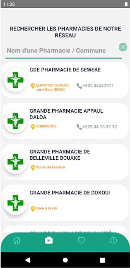 1. The list of all pharmacies in the network with the option of searching by municipalities or by pharmacy name
