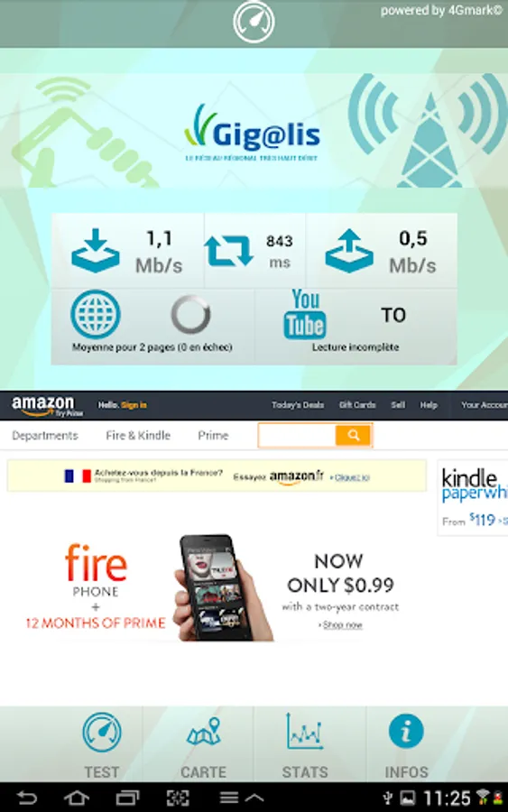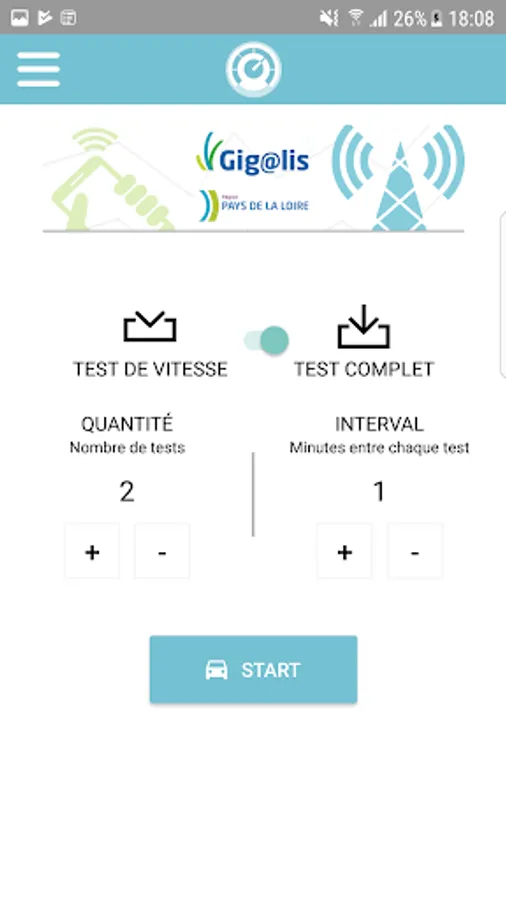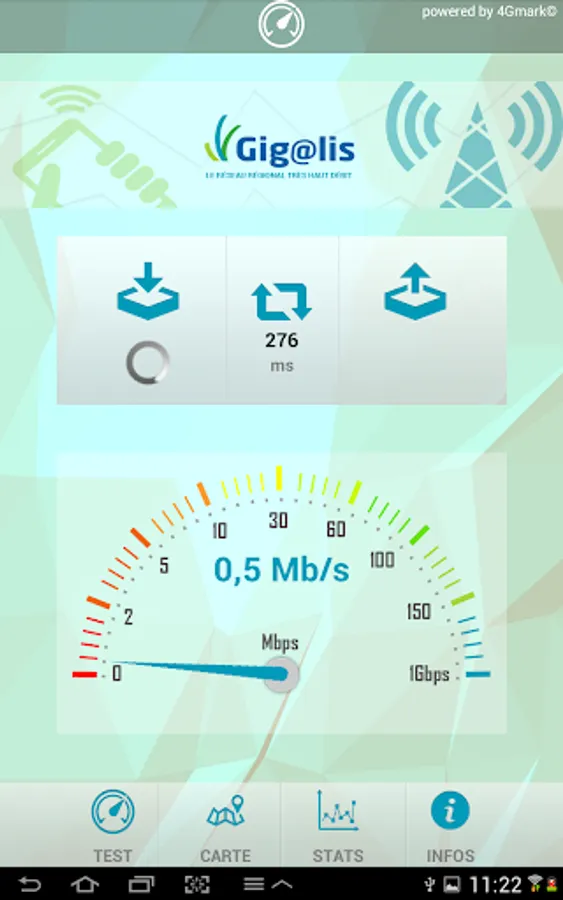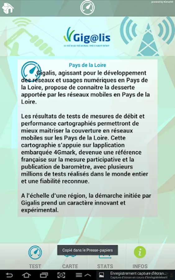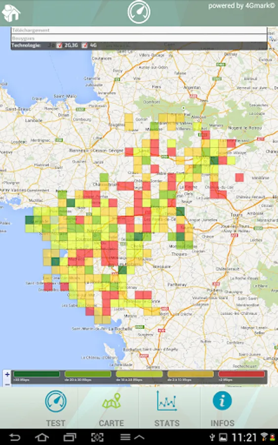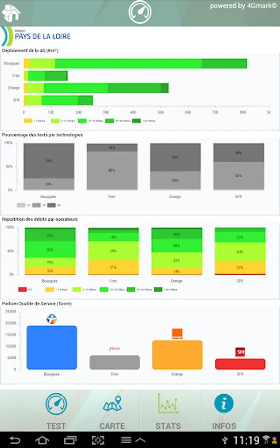 The proposed joint association of Pays de la Loire, Gigalis tool allows you to measure the speed and quality of service of 2G / 3G connections / 4G your operator (Orange, SFR, Bouygues-Telecom, Free, Virgin- Mobile ... etc.)