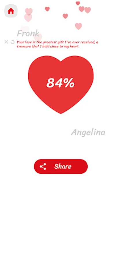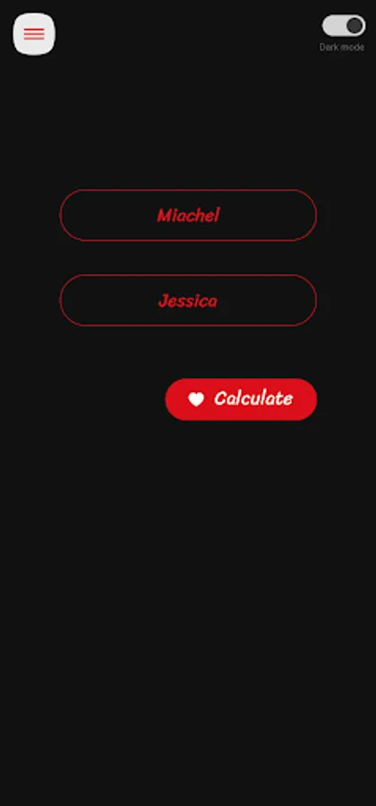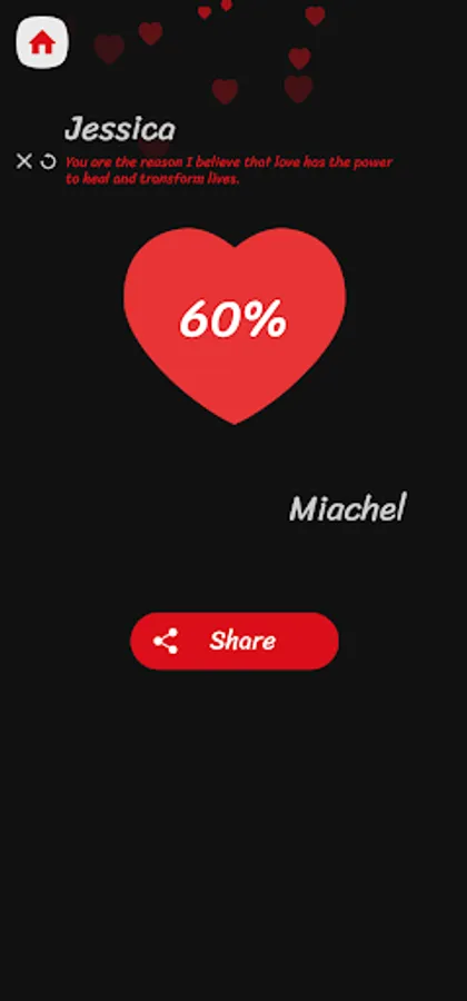 LoveMania - Discover Your Compatibility & Relationship Strength! Want to know how compatible you are with someone special? Look no further! LoveMania is here to unveil the mysteries of love and measure the depth of your relationships. Simply enter the names of two individuals, and our powerful algorithm will analyze various factors to generate a percentage representing your love compatibility. Explore the emotional, intellectual, and romantic aspects of your connection through our detailed insights. Whether you're curious about a new flame or simply want to have fun with your partner, LoveMania provides an entertaining and interactive experience. Please remember, this app is purely for entertainment purposes, so enjoy the journey of love exploration with an open heart and a playful spirit. Let LoveMania be your guide to unraveling the secrets of love!