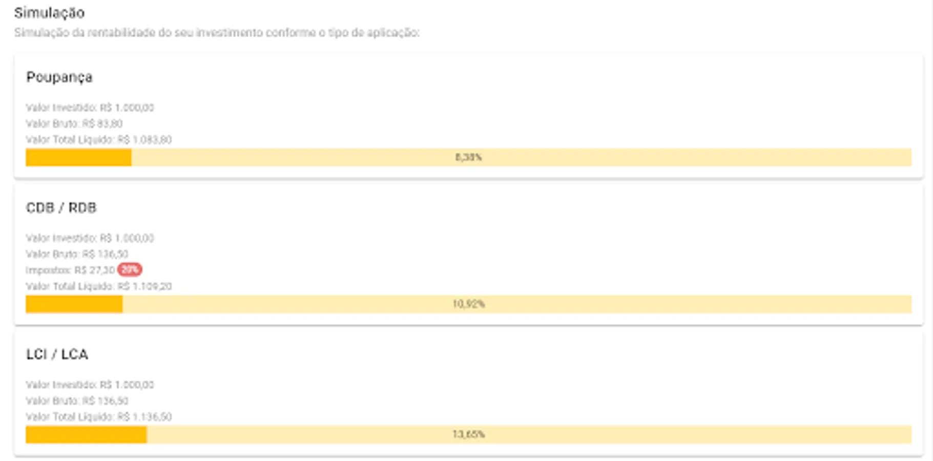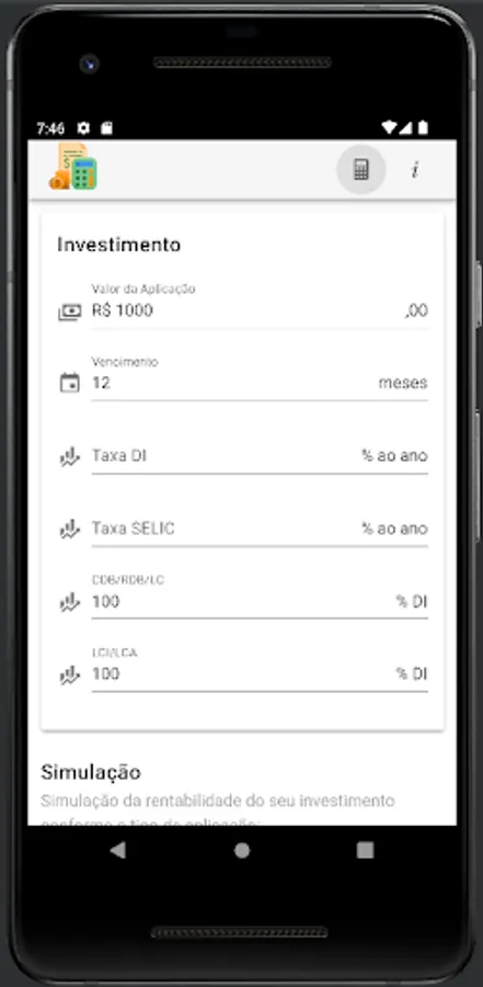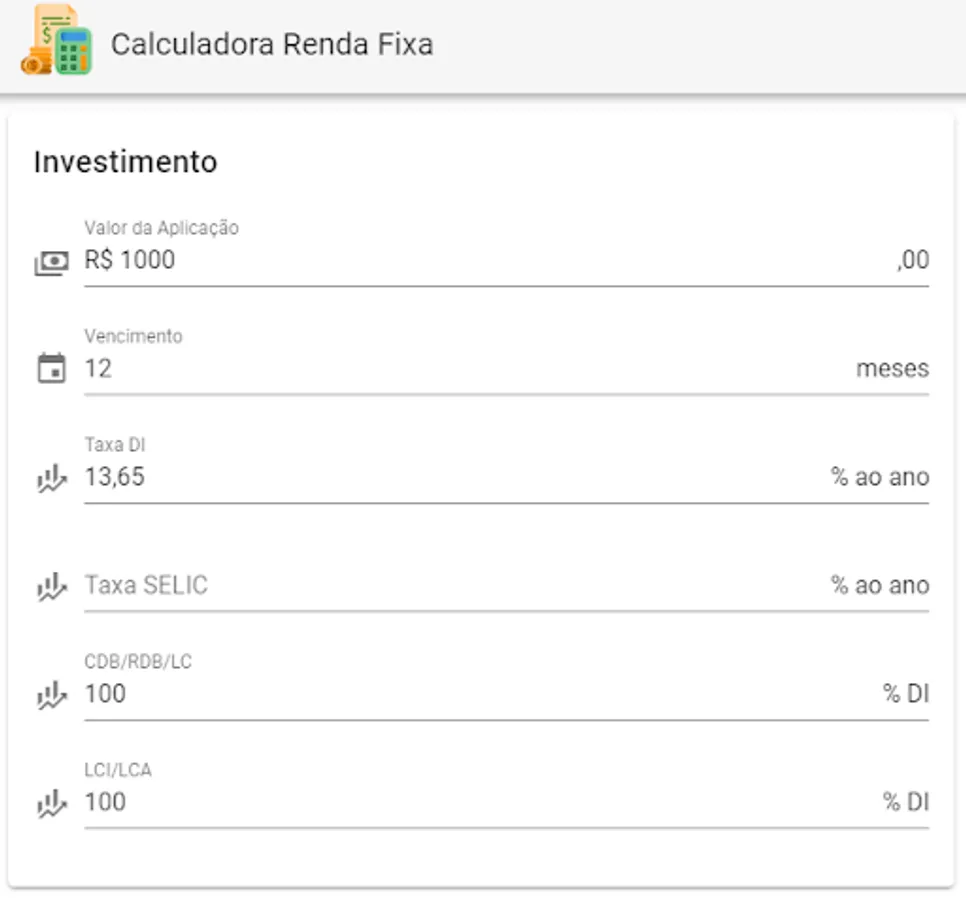 The Fixed Income and Investment Calculator based on the Selic Rate makes it possible to calculate the total amount that will be returned upon maturity of the security, taking into account the interest rate and investment time. The user will enter the amount invested, the investment time and the interest rate to calculate the total amount to be returned.
