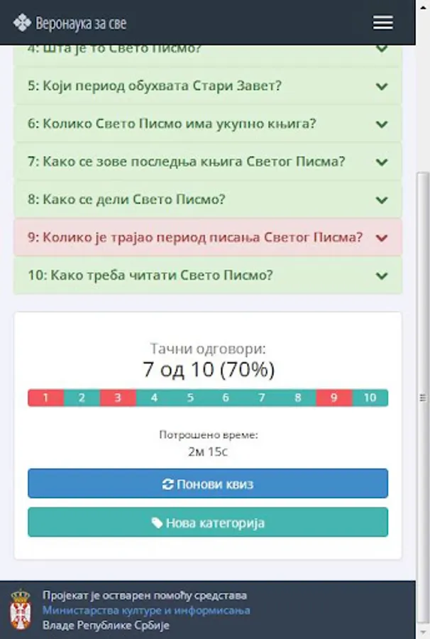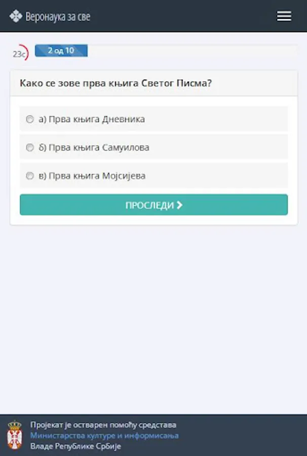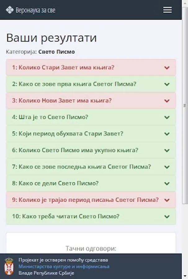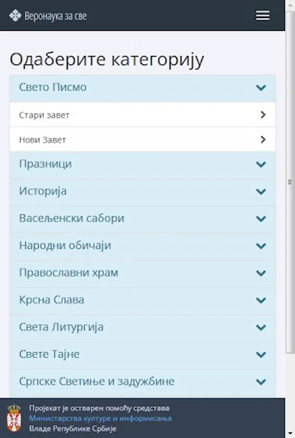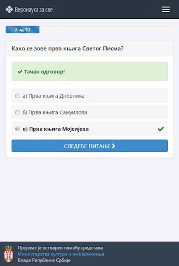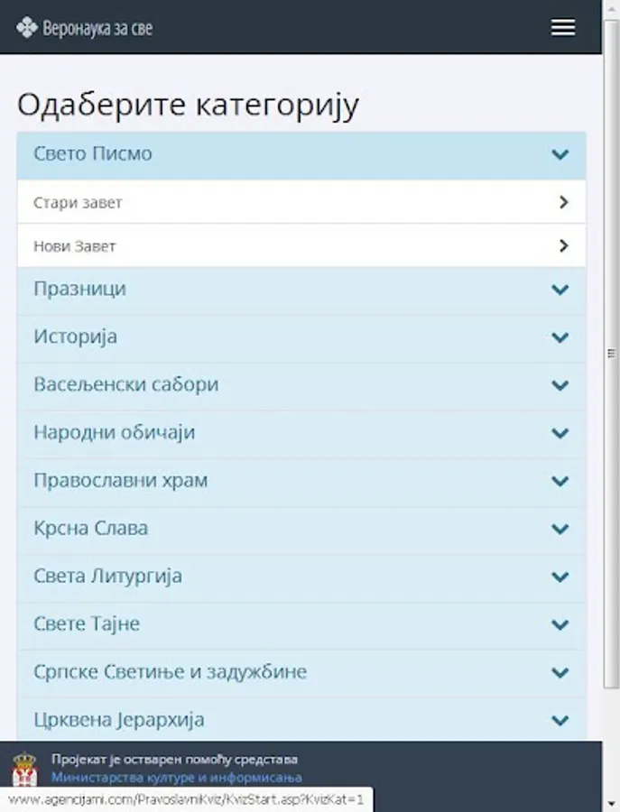 With the application "Religious Education for All", we want to bring closer the Orthodox teaching about God, as well as about Serbian history and personalities who marked the intertwined history of the Serbian Church and the Serbian state. In an interesting and interactive way, through a quiz, each of the users of the application will be able to get acquainted with religion, history and tradition.